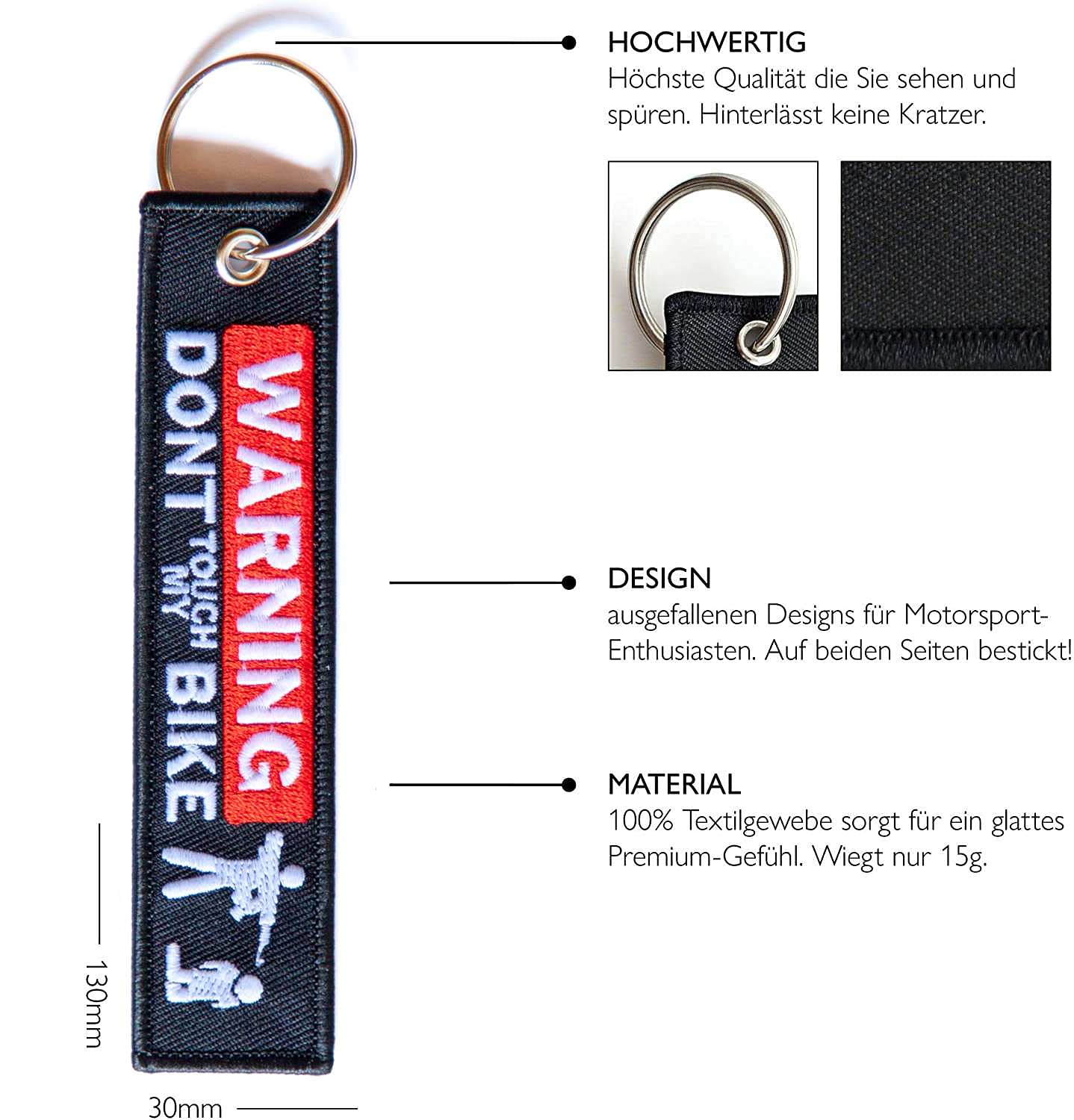 KRATZFEST - Keine Sorge um Kratzer an deinem geliebten Motorrad! Unsere Schlüsselanhänger sind aus strapazierfähigem Gewebe gefertigt und verfügen über keine scharfen Ecken oder Kanten.